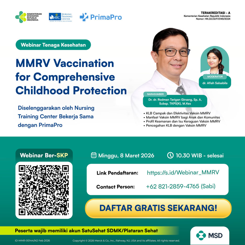 Simak webinar "MMRV Vaccination for Comprehensive Childhood Protection" yang menghadirkan paparan dari Dr. dr. Rodman Tarigan Girsang, Sp.A, Subsp. TKPS(K), M.Kes dengan dr. Afiah Salsabila sebagai moderator. Webinar ini mengulas peran vaksin MMRV dalam pencegahan campak, gondongan, dan rubella, dengan menekankan efektivitas, keamanan, serta manfaat jangka panjang vaksinasi rutin dalam melindungi kesehatan anak dan komunitas, sekaligus memperkuat upaya pencegahan KLB yang relevan dalam praktik klinis sehari-hari.