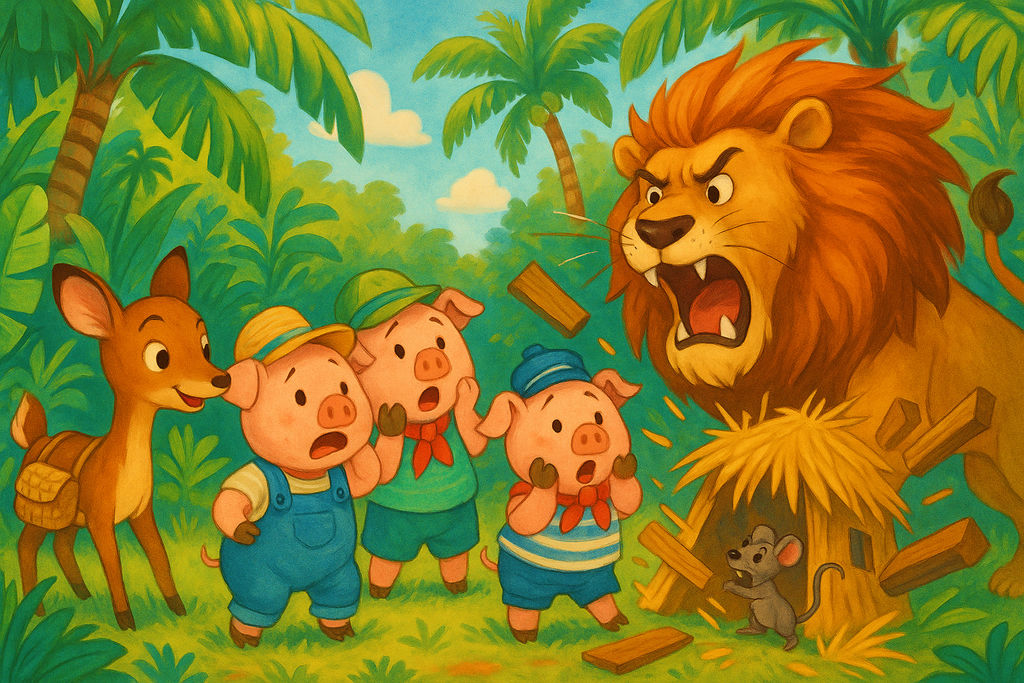 Di sebuah hutan yang rindang, hiduplah Si Kancil yang cerdik dan penuh akal. Suatu hari, Si Kancil jalan-jalan dan bertemu dengan Tiga Babi Kecil yang sedang sibuk membangun rumah mereka masing-masing.