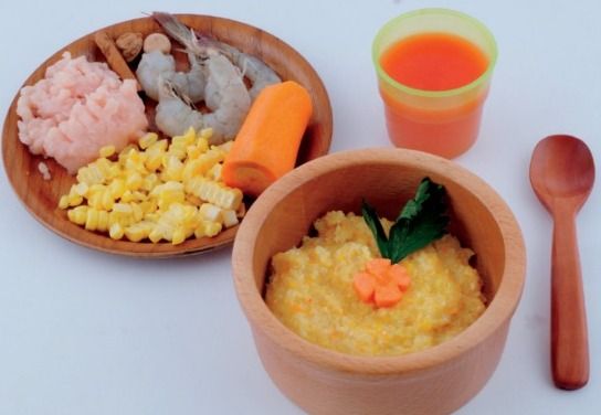 - Tambahkan potongan ayam, udang, wortel dan jagung, masak sambil sesekali diaduk. Jika dirasa kurang air, tambahkan kembali airnya, aduk hingga rata. Kemudian matikan api, saring sesuai tekstur yang dinginkan. Sajikan.