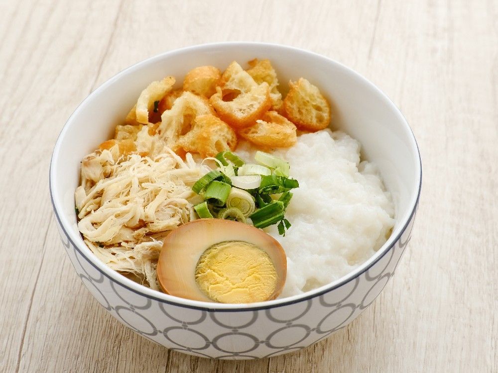 - Hidangkan bubur dengan potongan hati ayam, kacang kedelai goreng, dan telur rebus.
