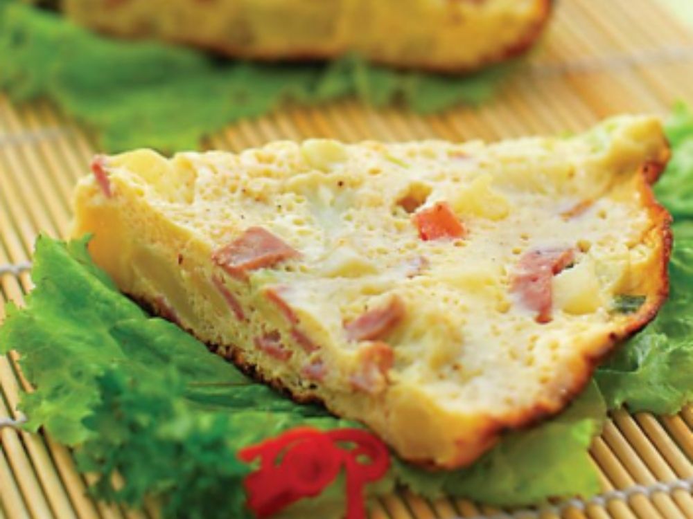 - Panaskan margarin dalam wajan. Tuang adonan telur, masak dengan api sedang hingga matang. Angkat, potong-potong setelah dingin. Sajikan fritata bersama saus tomat.