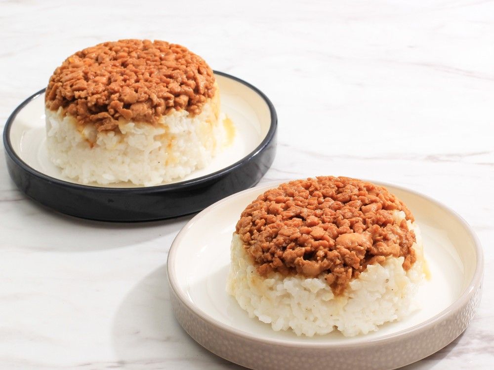 - Siapkan mangkuk. Letakkan telur di dasar mangkuk. Tambahkan tumisan daging dan nasi aron. Padatkan.