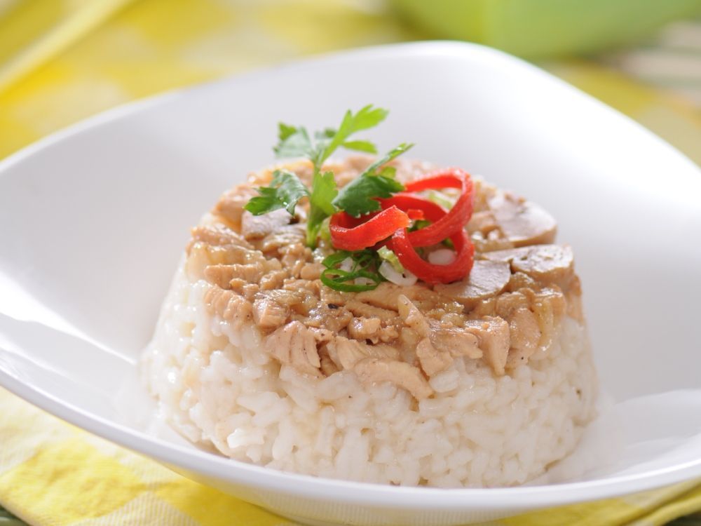 - Masukkan nasi putih, ikan tuna yang sudah dihaluskan, telur puyuh, dan minyak kelapa ke dalam mangkuk tahan panas (mangkuk tim).