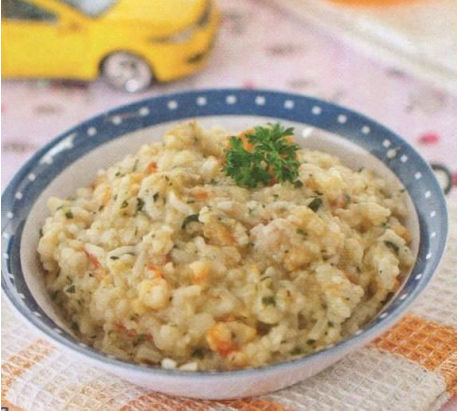 - Tim nasi putih bersama air kaldu ayam dengan api kecil.