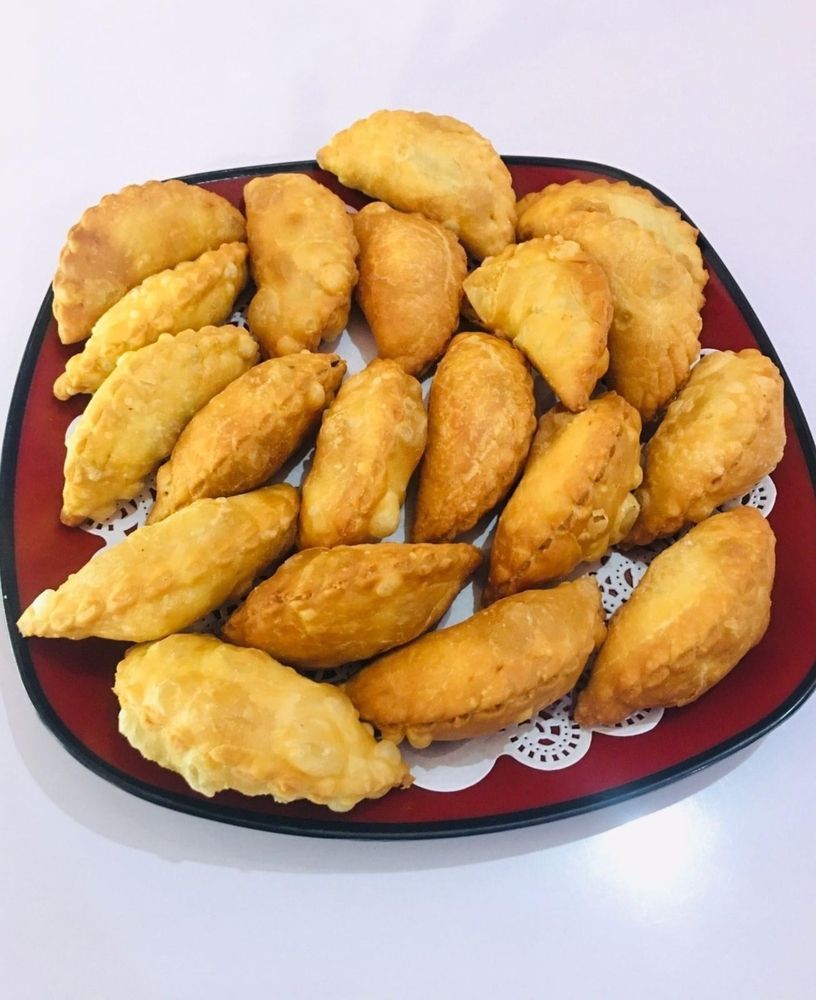4.⁠ ⁠Beri isian, lipat setengah lingkaran, rekatkan dengan air, lalu pilin tepinya,