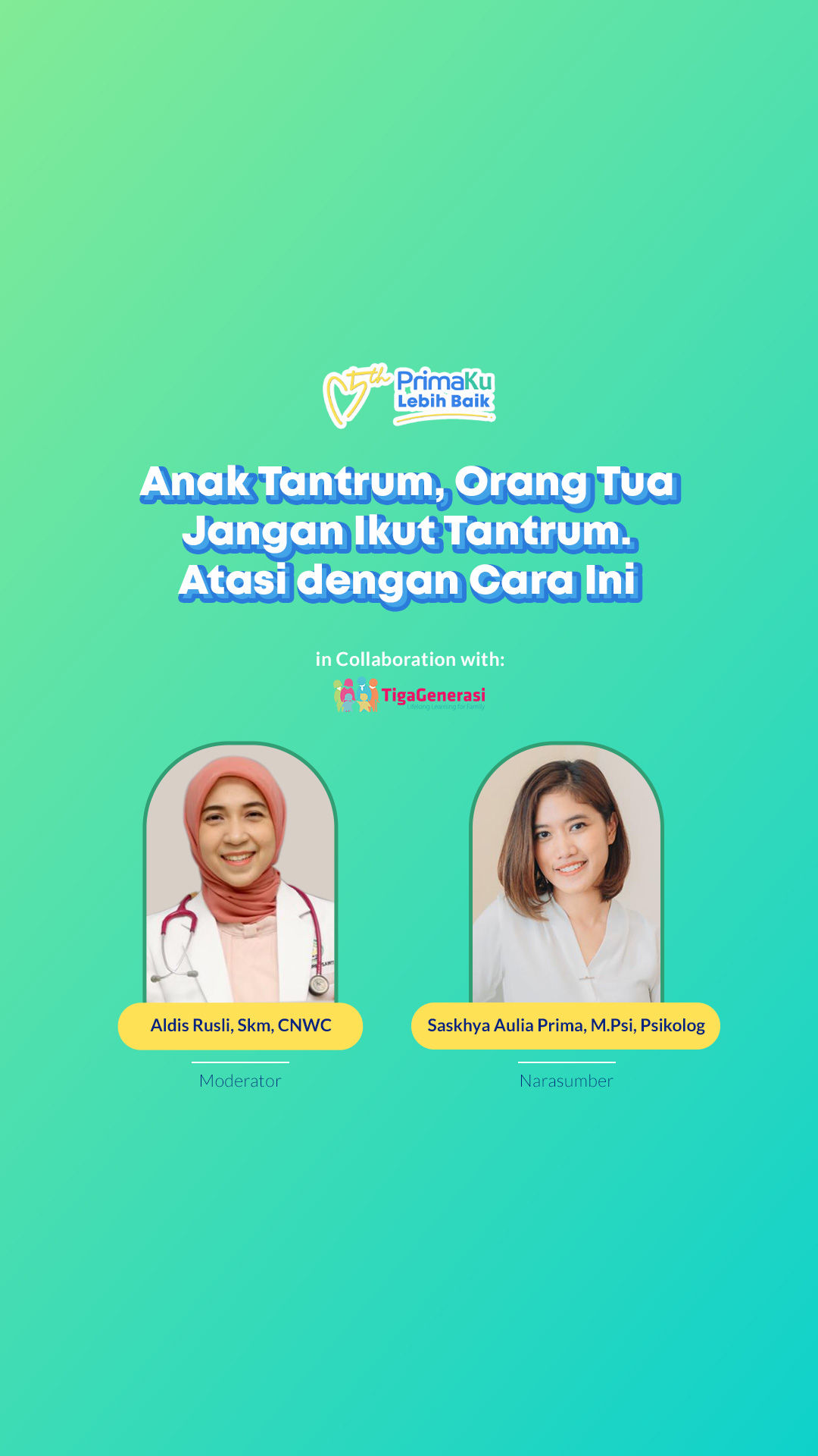 Tantrum adalah salah satu cara seorang anak untuk mengekspresikan dan mengelola perasaannya, serta salah satu usahanya untuk mengubah apa yang terjadi di sekitarnya. Jika si Kecil tantrum, MomDad jangan ikutan tantrum. Yuk, tonton ulang Instagram Live PrimaKu di atas untuk tahu bagaimana cara yang tepat atasi anak tantrum bareng TigaGenerasi!