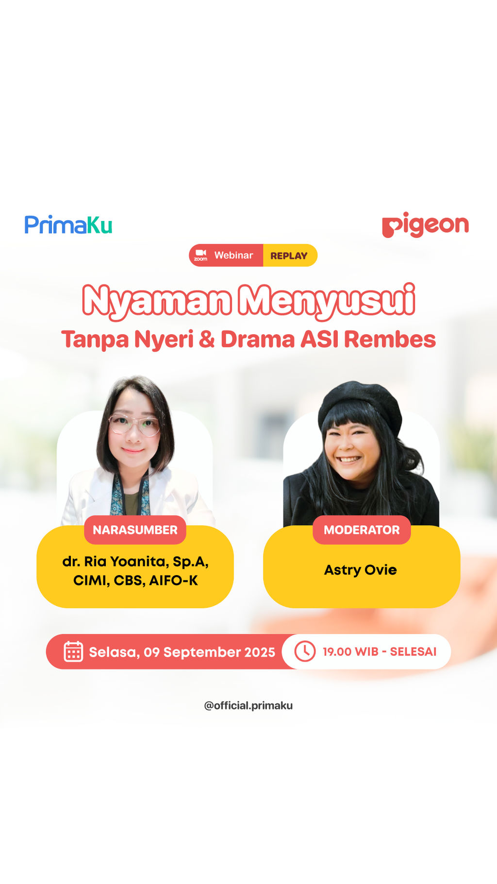 Webinar PrimaKu x Pigeon kali ini membahas topik “Nyaman Menyusui Tanpa Nyeri & Drama ASI Rembes” bersama dr. Ria Yoanita, Sp.A, CIMI, CBS, AIFO-K dan dipandu oleh Astry Ovie. Di sini MomDad akan mendapat penjelasan seputar cara mengatasi nyeri saat menyusui, solusi menghadapi ASI rembes, serta tips menjaga kenyamanan ibu dalam perjalanan mengASIhi. Saksikan rekamannya sampai selesai dan temukan insight yang bisa bantu perjalanan menyusui jadi lebih tenang dan percaya diri.