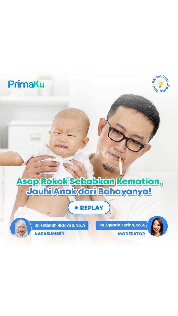 Untuk mengurangi terjadinya dampak buruk di atas sekaligus sebagai ajang edukasi kepada para orang tua & banyak orang, PrimaKu akan mengupas tuntas mengenai bahaya asap rokok terhadap anak bersama dr. Fatimah Hidayati, Sp.A & dr. Ignatia Karina, Sp.A.