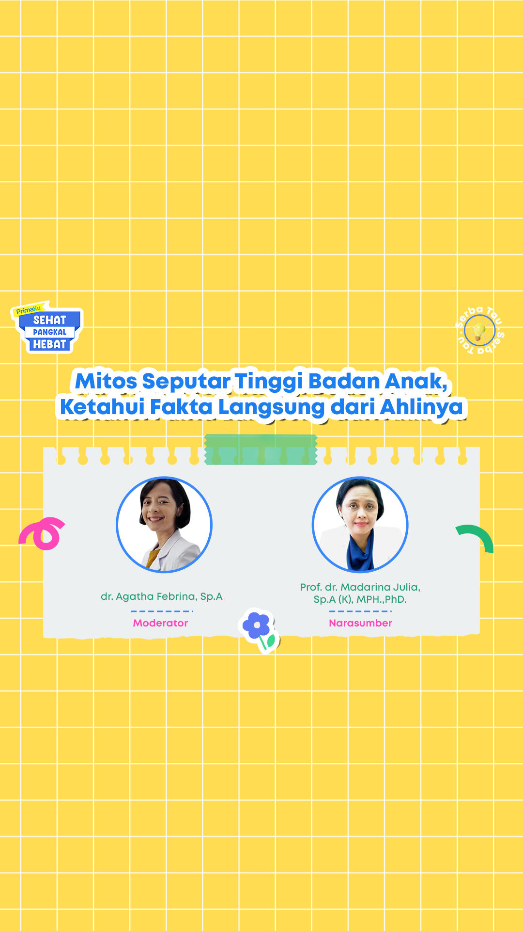 Ternyata, banyak banget mitos yang beredar di masyarakat mengenai tinggi badan anak, untung aja udah nonton PrimaKu Serba Tau “Mitos Fakta Tinggi Badan Anak” bersama Prof. dr. Madarina Julia, Sp.A (K), MPH.,PhD. & dr. Agatha Febrina, Sp.A.